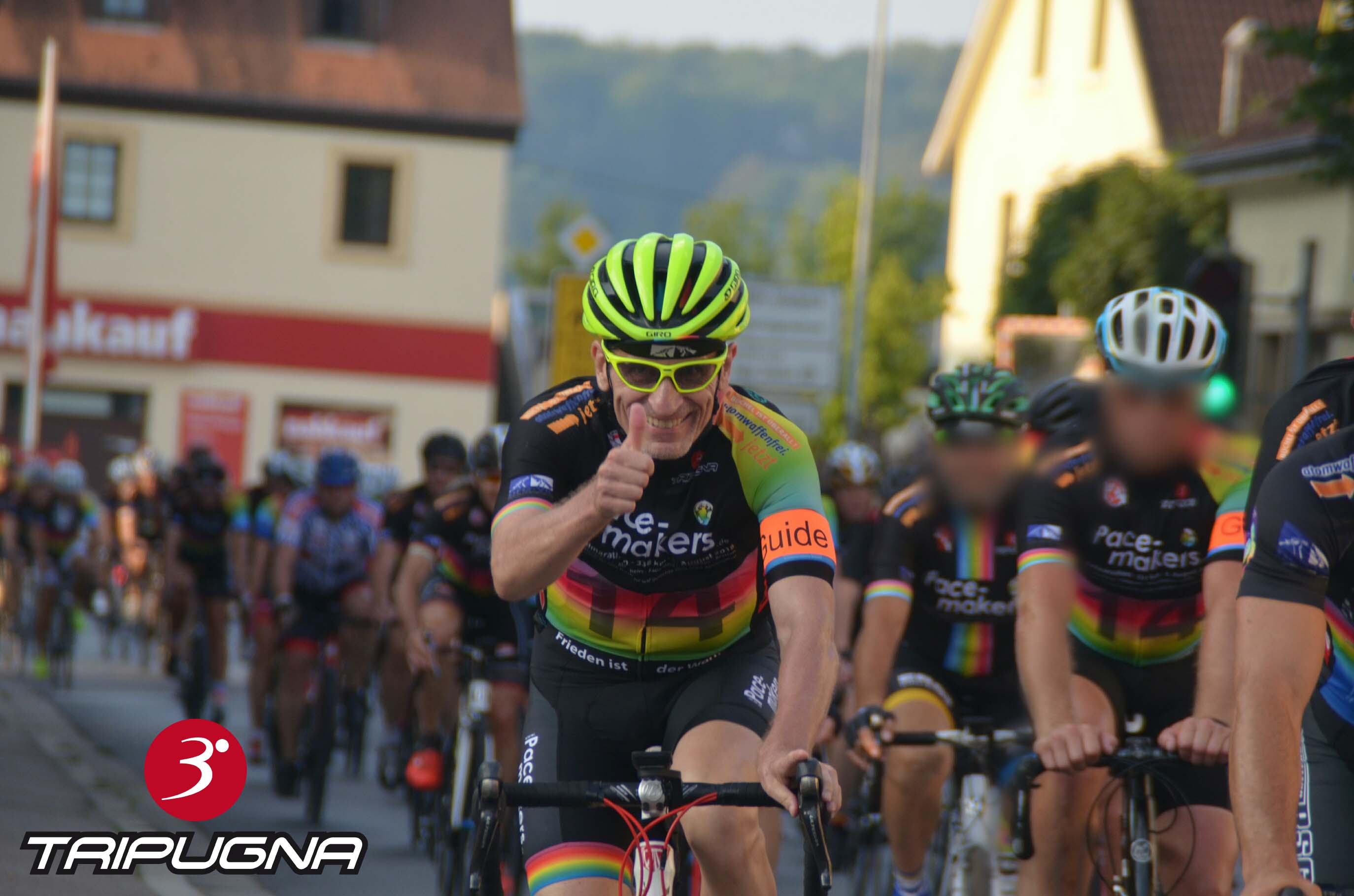 "Frieden ist der Weg", unter diesem Motto fand am 04. August 2018 wieder der alljährliche Pacemakers Radmarathon statt. 343 Kilometer auf dem Rennrad für eine friedliche und gerechte Welt ohne Atomwaffen von Bretten über Heidelberg, Mannheim, Kaiserlautern, durch den Pfälzer Wald nach Landau und wieder zurück nach Bretten mit durchaus sportlicher Geschwindigkeit von knapp 30km/h. Wie jedes Jahr rollte das Pacemakers Peloton natürlich auch durch Hoffenheim, dem Hauptsitz von 3°TRIPUGNA© (siehe Foto). Sehr gerne haben wir wieder durch Lieferung der Radbekleidung im Pacemakers Design sowie als Teil des Organisationsteams mitgeholfen, dass dieses außergewöhnliche Radsportevent ein voller Erfolg wird. Herzlichen Dank an Mr. Pacemakers Roland Blach, dem hauptverantwortlichen Organisator dieses Radmarathons, für die mehr als perfekte Planung und Umsetzung. Danke auch an alle Beteiligten in den Begleitfahrzeugen, an den Verpflegungsstationen sowie an die Polizei, ohne Euch wäre dieser Radmarathon nicht durchführbar. Respekt geht an alle Radsportlerinnen und Radsportler, die sich dieser Herausforderung bei hochsommerlichen Temperaturen von teilweise über 35° gestellt haben. Wir freuen uns schon sehr auf das Pacemakersjahr 2019, die Planungen dafür laufen bereits.